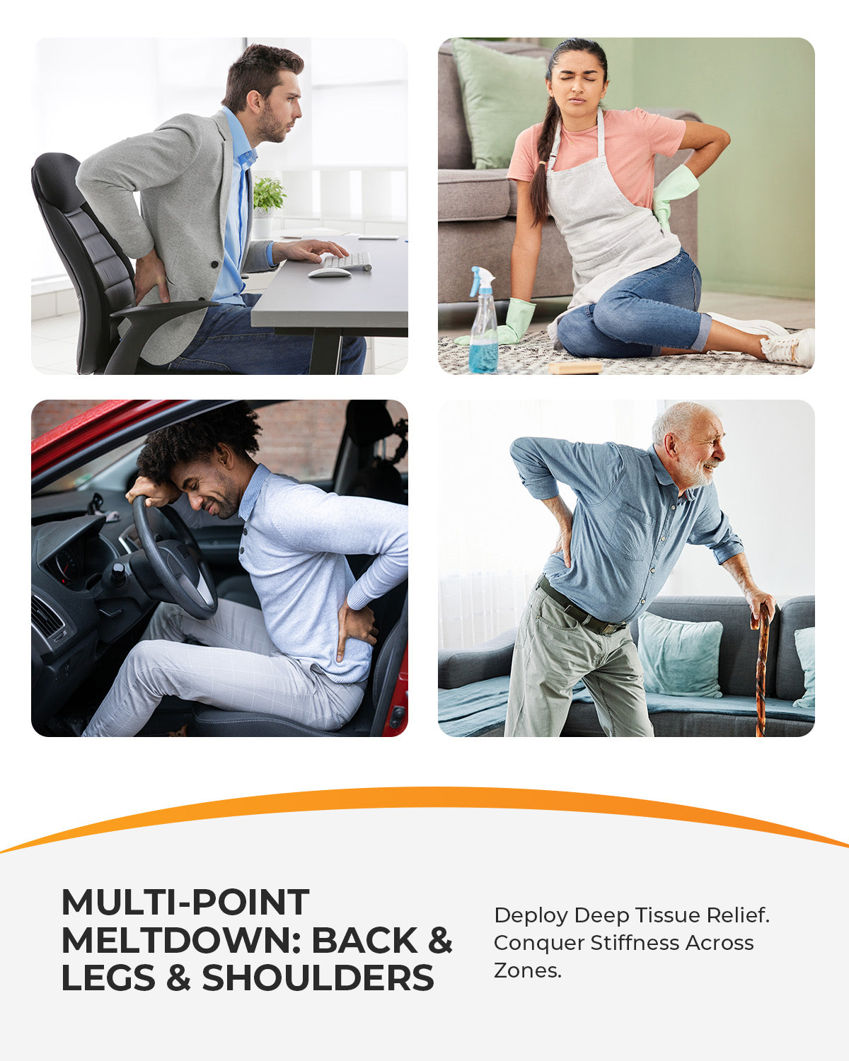 - 【2 Level Heating for Warmth】This massager includes two heating zones: the massage heads maintain a gentle 95°F (35°C) temperature to improve comfort and glide, while the lower back pad offers two levels of warmth (118°F / 129°F). The upgraded heat function covers more surface area, quickly penetrating stiff muscles to enhance pain relief and soothe tightness in the lower back and shoulders.