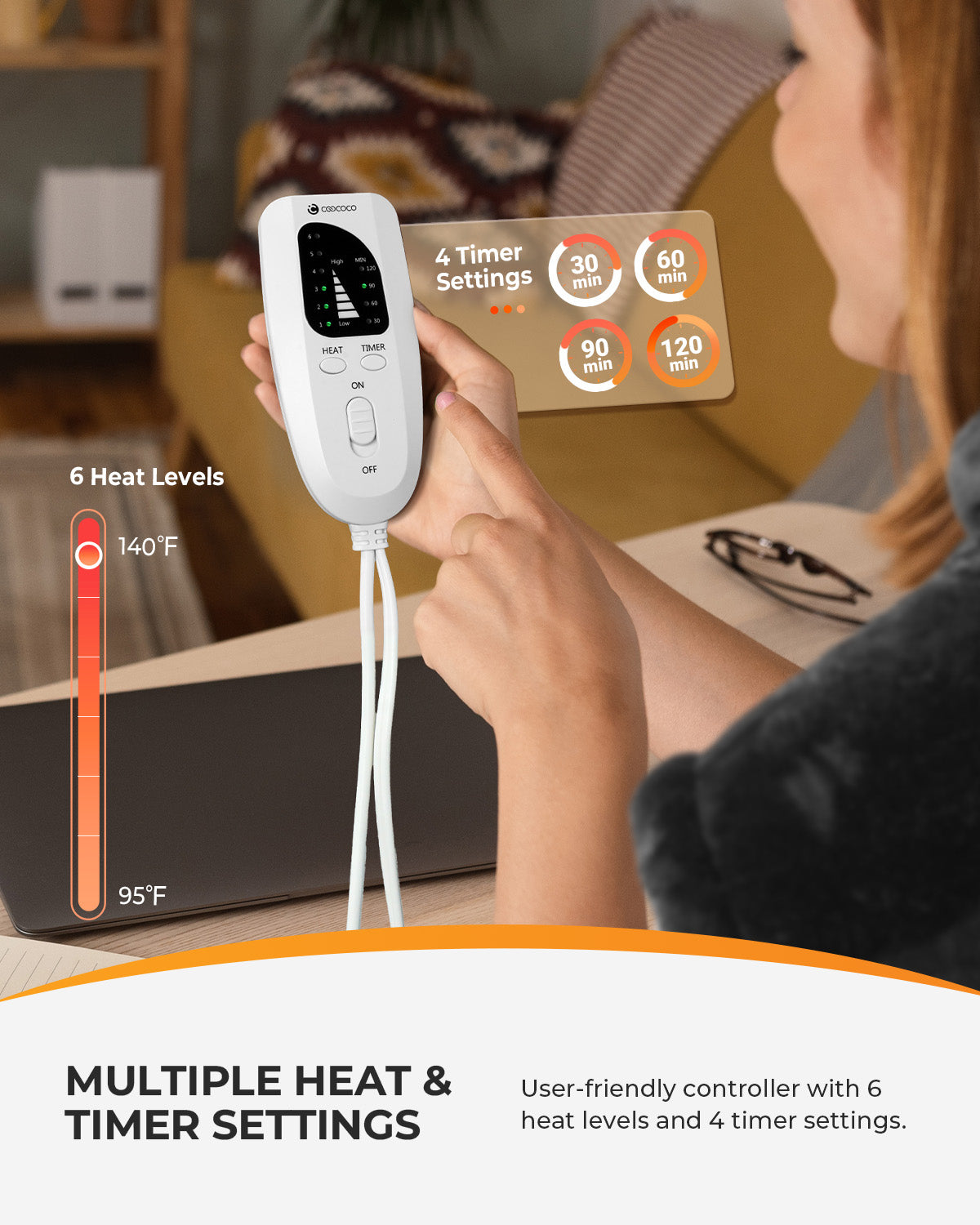Choose from 6 heat settings and 4 auto shut-off timers (30–120 min).